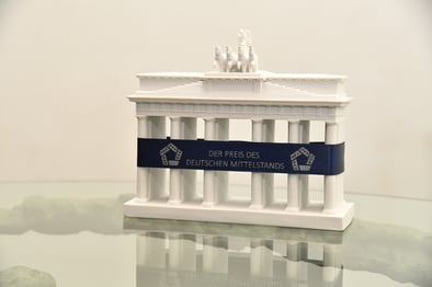 Das Preissymbol des Preises des Deutschen Mittelstands ist eine Porzellan-Skulptur des Brandenburger Tores aus der Königlichen Porzellan Manufaktur Berlin.