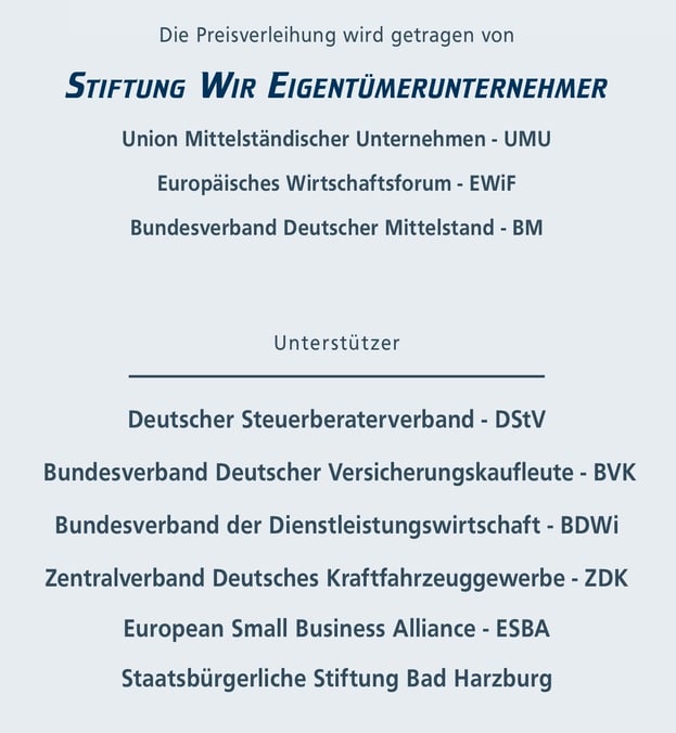 Verliehen wird der Preis von der Stiftung Wir Eigentümerunternehmer, in Zusammenarbeit mit Verbänden des deutschen Mittelstands, so der Wir Eigentümerunternehmer-Verbandsgruppe, dem Bundesverband der Dienstleistungswirtschaft, dem Bundesverband Deutscher Versicherungskaufleute, dem Deutschen Steuerberaterverband, dem Zentralverband Deutsches Kraftfahrzeuggewerbe, der European Small Business Alliance sowie der Staatsbürgerlichen Stiftung Bad Harzburg. Diese Verbände vertreten zusammen über 1 Million Klein- und Mittelbetriebe sowie Freiberufler.